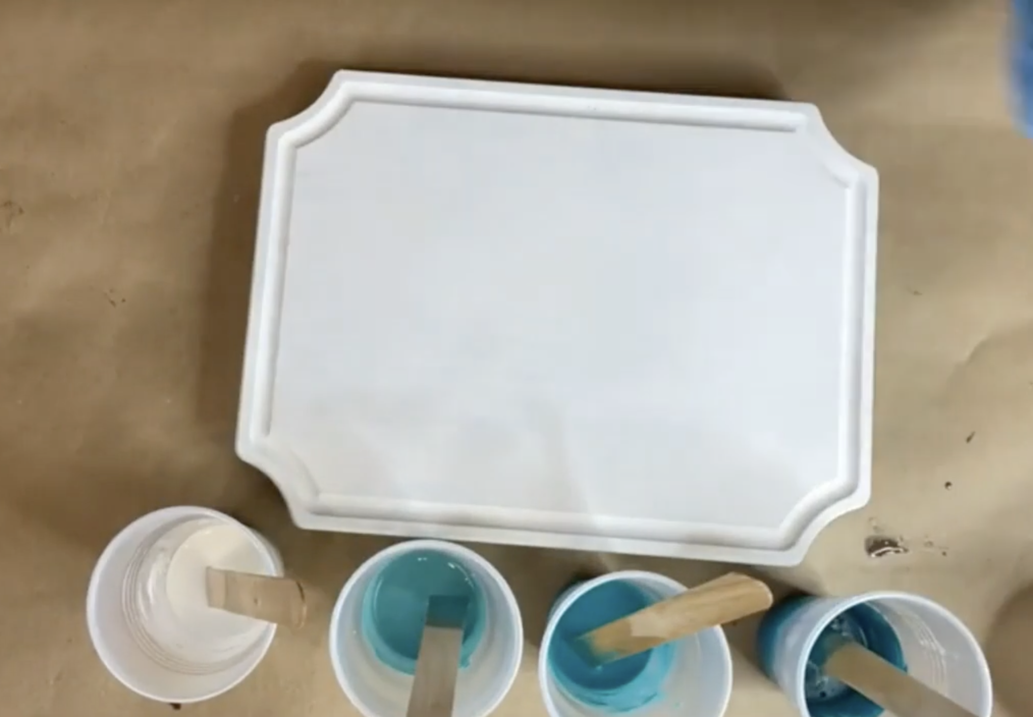 Next, divide the mixed resin into four small cups. The largest amount will be tinted white (about a tablespoon of acrylic paint), which serves as the base. Then, in the remaining three cups, add various shades of blue—light, medium, and a dark metallic teal. Mix each color thoroughly. If the resin feels a little thick, especially the metallic, a drop or two of denatured alcohol can help loosen it up.