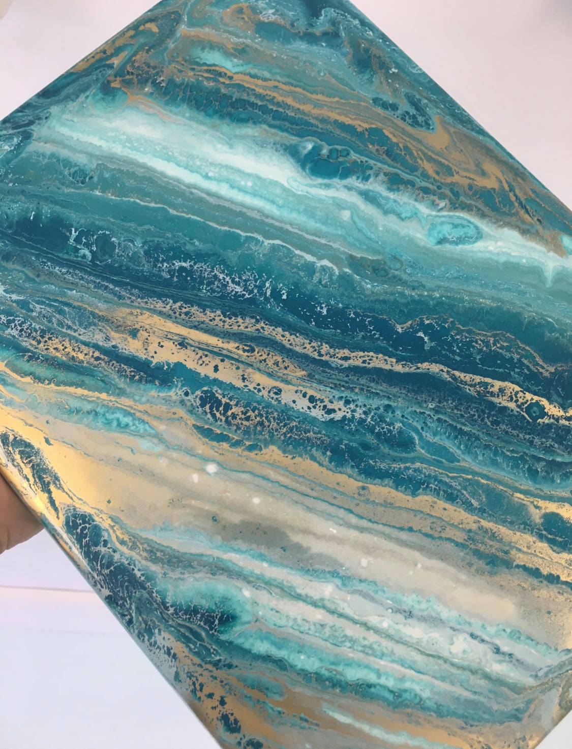 Now comes the fun part: pouring. Start by covering about 70% of your board with the white resin, letting it drip off the edges. Then, randomly pour the three blue colors into the empty areas of the board. There’s no right or wrong way to do this, just go with what feels right and trust your eye. Make sure to fill in any bare spots and coat the edges for a clean, finished look.