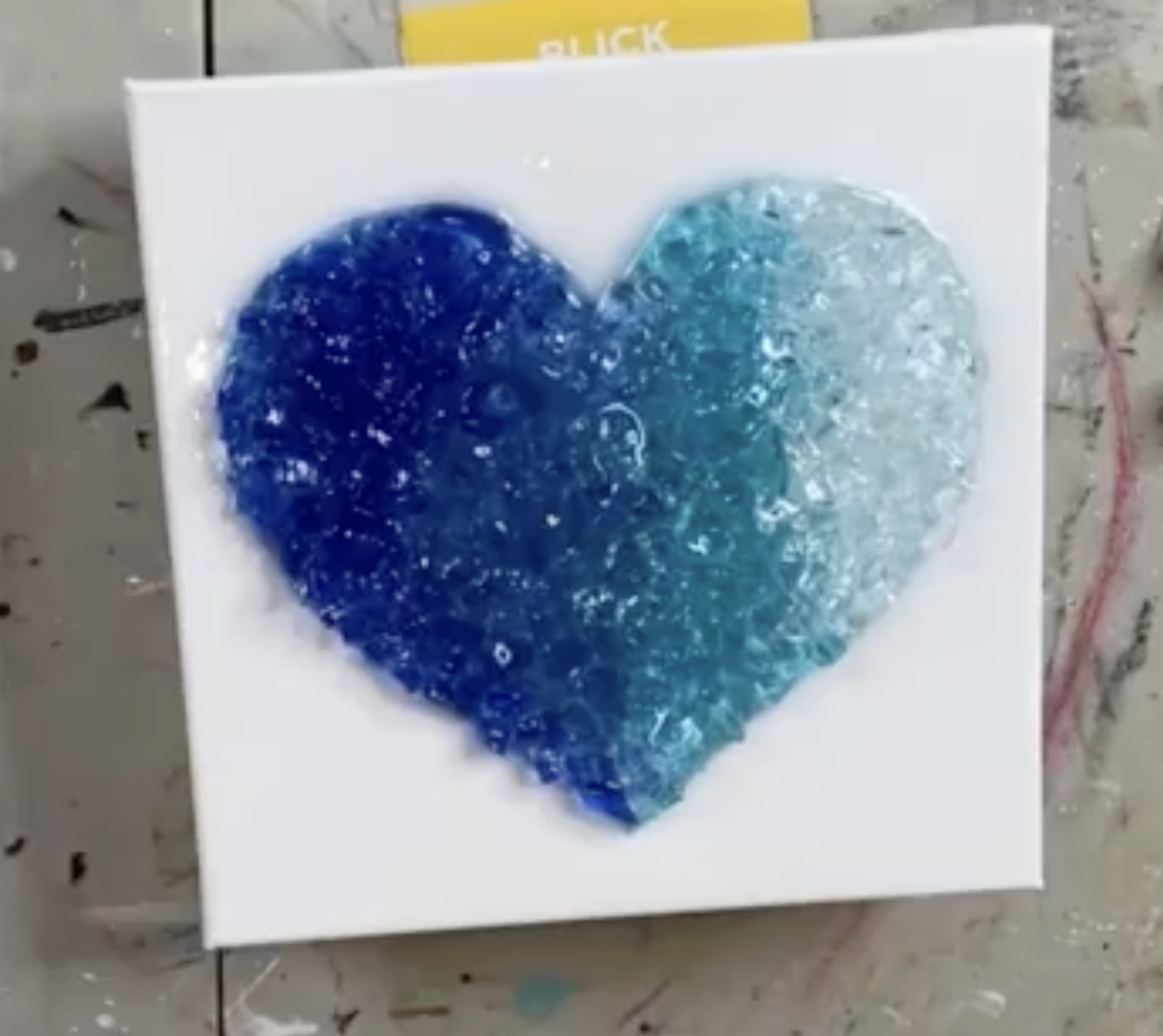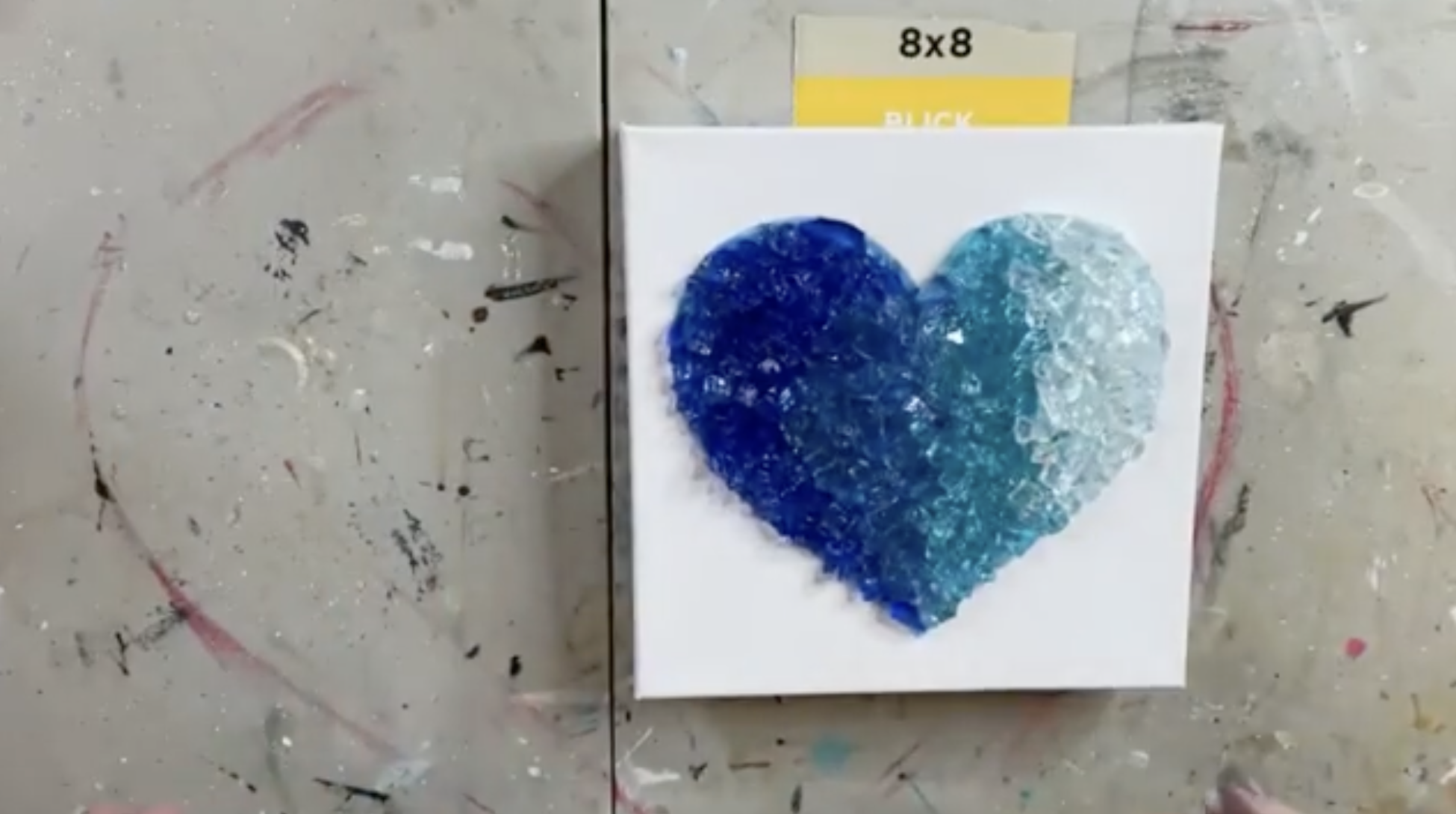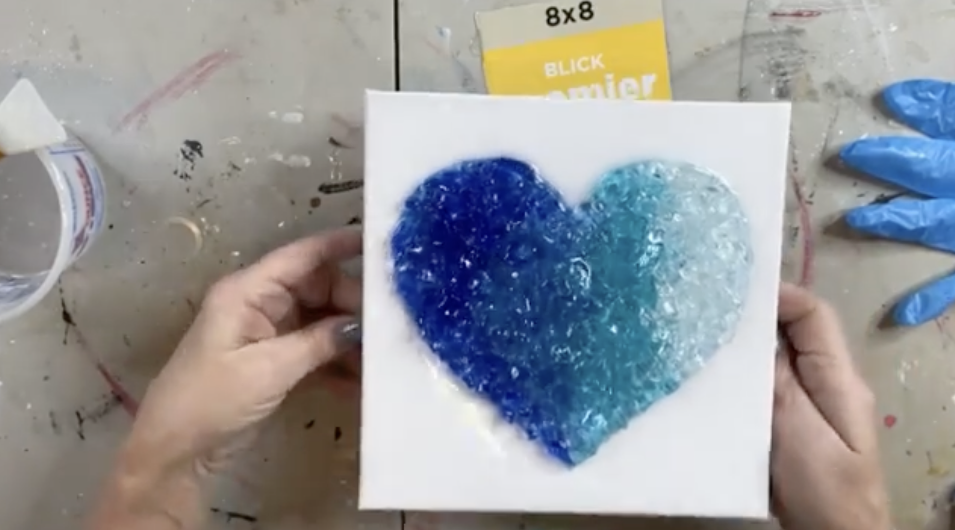 This quick little project is one of those pieces that looks way more advanced when it’s finished. You’ll lightly trace a heart onto an 8x8 canvas, paint a simple two-color ombre undercoat, then build a dimensional glass gradient using four shades: Cobalt → Pacific Blue → Caribbean Blue → Clear. Finish it off with a thin resin coat, pop bubbles, and you’ve got a sparkly, textured heart that’s perfect for Valentine's Day or any time of the year.