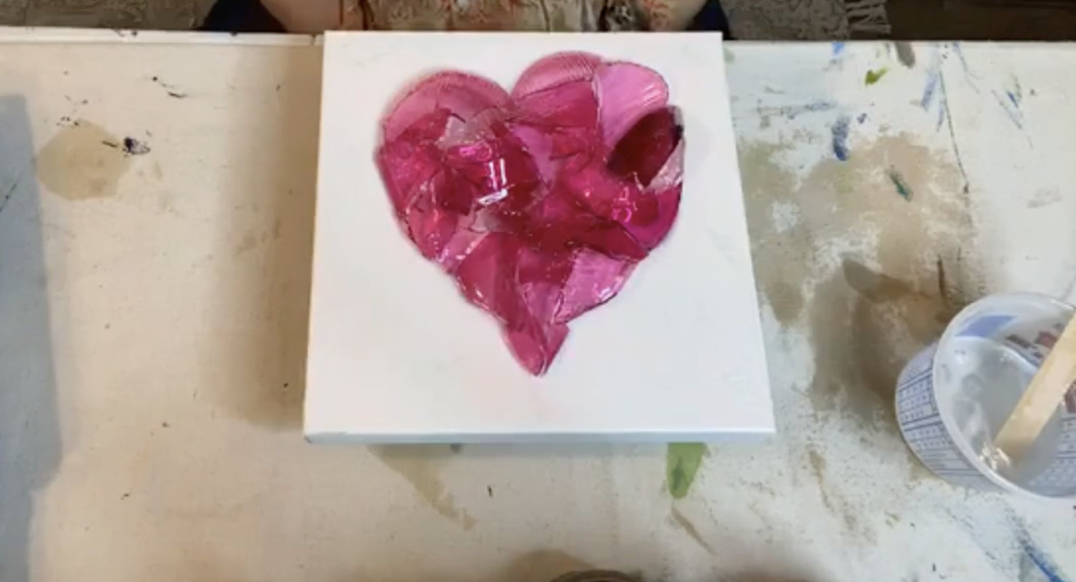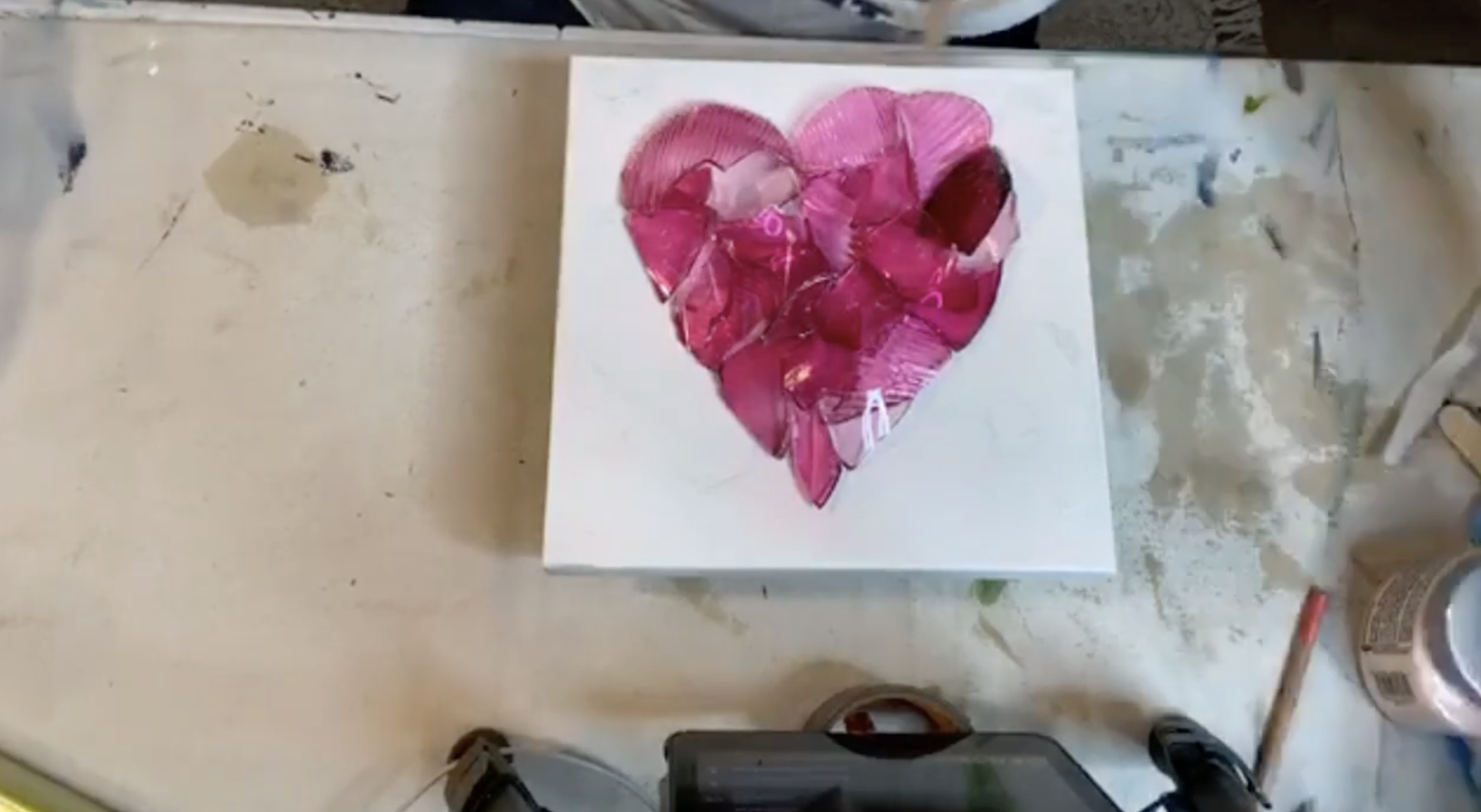 This project is a sweet, super-dimensional pink glass heart made from busted vase glass layered on a soft, pearly pink background. It’s imperfect on purpose because the variety of shapes and shades is what makes it so charming! This project is beginner-friendly and perfect for Valentine's Day or just sharing the love through art.