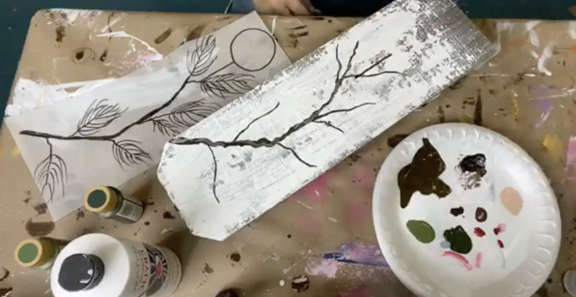 Without fully cleaning your brush, add a tiny touch of white paint to the tip of the brush and lightly drag it down parts of the branch to create dimension. Because your brush is already dirty with brown, the white won’t look stark - it will create a lighter brown highlight. Don’t do every line, just skip around for subtle variation.