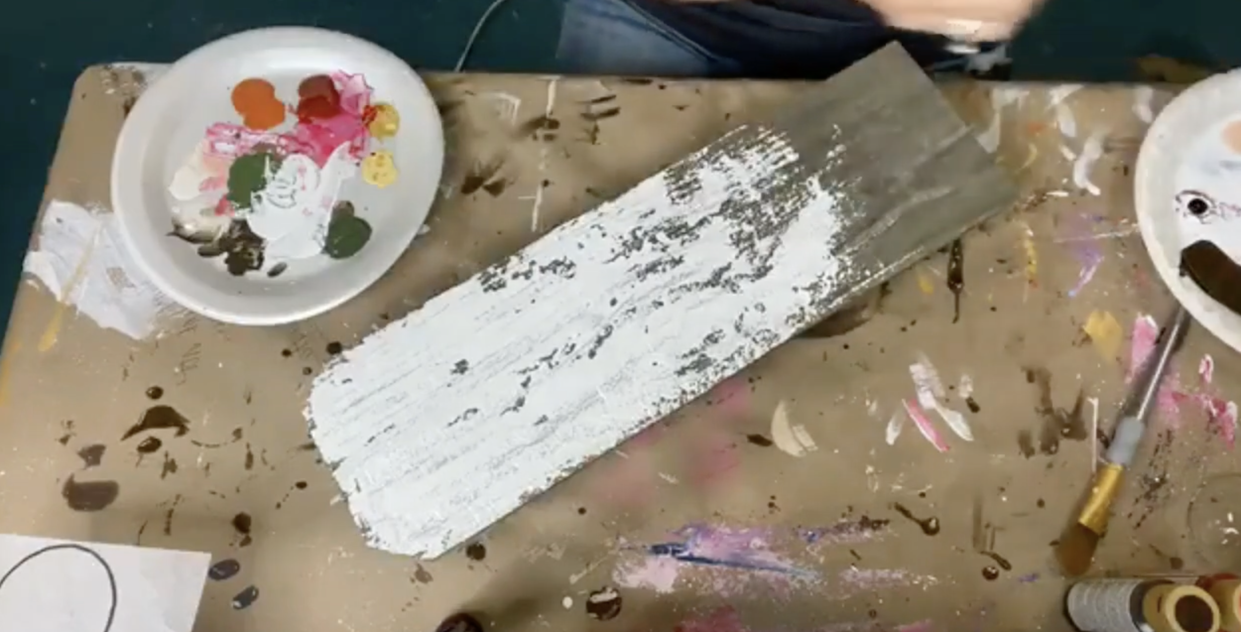 Squeeze out heavy body Titanium White onto a palette. Using a palette knife or small trowel, scoop thick paint and pull it down the board from the top, letting it skip and catch on the grain. Don’t cover the entire board - this is meant to feel distressed and imperfect, with some wood still showing through.