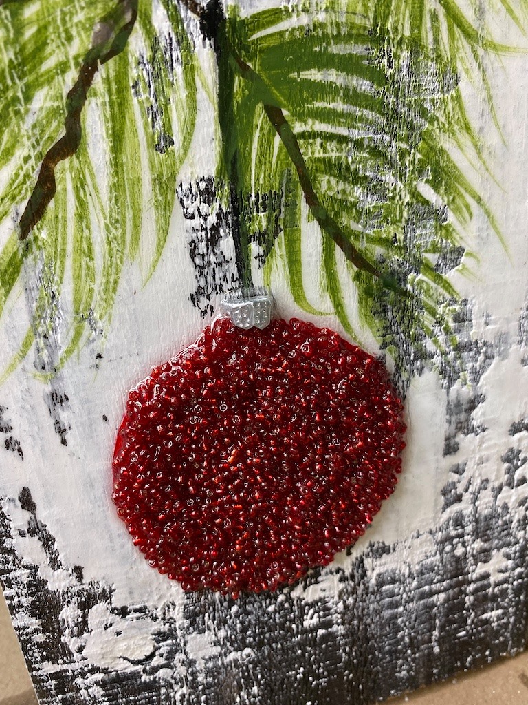 While the bead layer dries (or after you’ve done your second layer), paint a small ornament topper at the top of the red circle using FolkArt Sterling Silver and a small flat brush. Optional upgrade: If you have a small metal/plastic topper piece from a mini ornament or a Christmas tree decoration, you can cut it and glue it on for extra dimension.