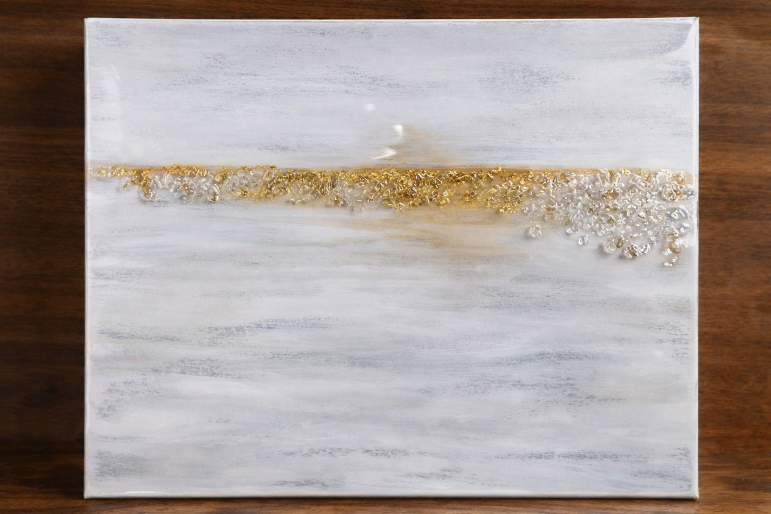 Without worrying about cleaning the brush perfectly, add a touch of metallic taupe/champagne around the horizon line and into the “sun” area. This ties in beautifully with the gold leaf and glass you’ll add later and keeps everything soft and cohesive.