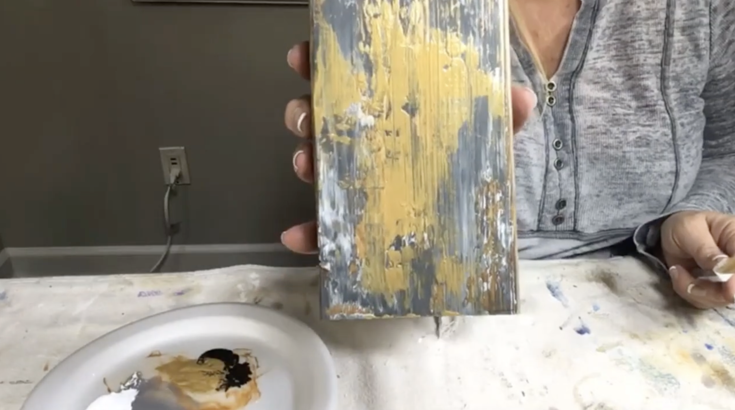 Using a palette knife, apply your main color directly onto the wood surface. For this example, I’m using Ash gray, but the same process applies if you choose Desert Turquoise or any other color. Lightly skim the paint across the wood, allowing some of the stained wood to remain visible. The goal is not full coverage but movement and texture. After the main color is applied, use the same palette knife technique to lightly add white in select areas. Gently “tickle” the white across the surface so it blends naturally with the base color. This layering technique creates depth and prevents the background from looking flat or solid.