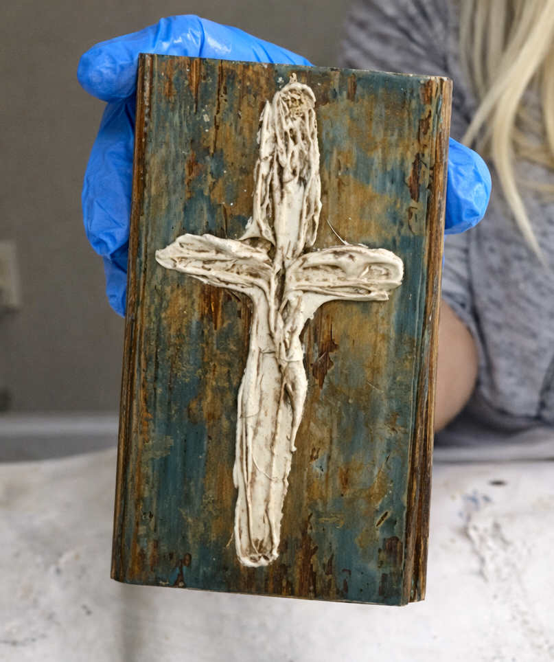 To create the cross, use modeling paste or Venetian plaster applied with a narrow palette knife. Begin with the vertical stroke, applying a generous amount so it has noticeable dimension. Then add the horizontal arms, again allowing texture and natural knife movement to show. Venetian plaster is especially beautiful because it creates subtle crackling as it dries, adding even more character. Let this layer dry completely before moving on to glazing.