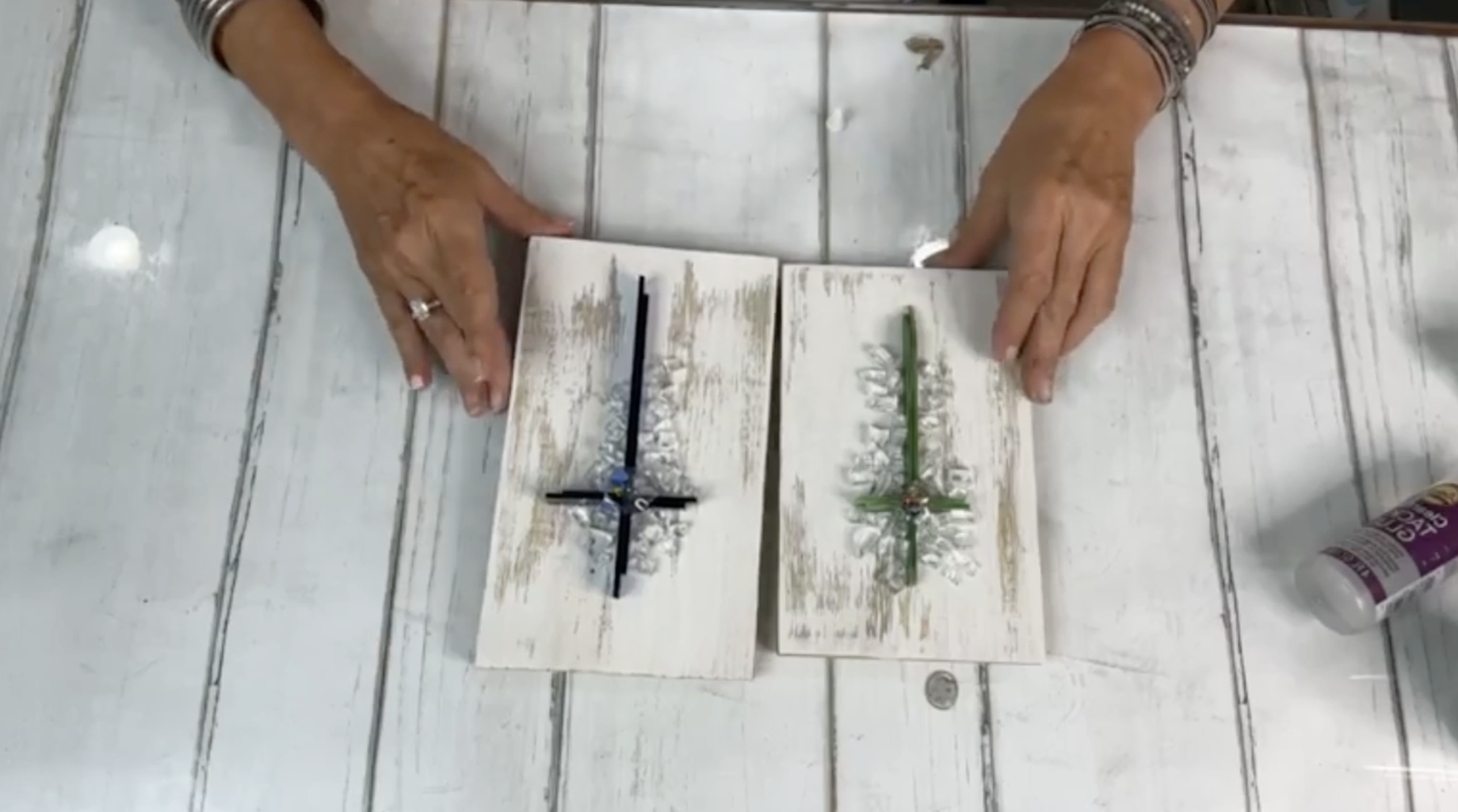 Each cross consists of two vertical strips and four smaller horizontal pieces. Start by gluing the vertical pieces together using Aleene’s Clear Tacky Glue or any fast-drying clear glue. Press them together and let dry for a moment before gluing them onto your wooden background. I like to space mine so there’s about an inch above and below the cross on the board.