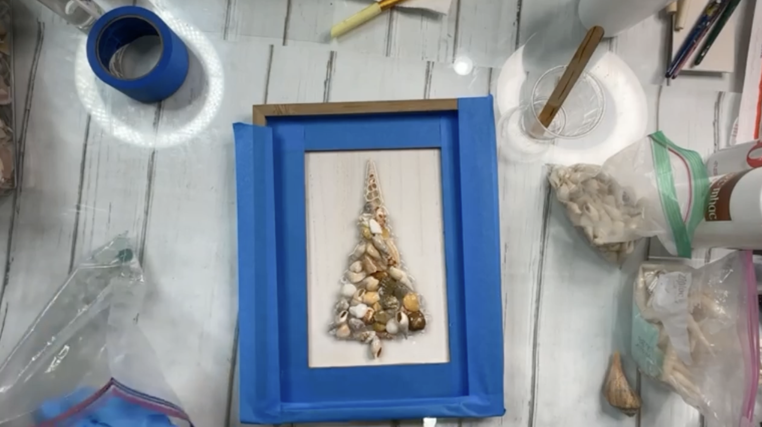 Sprinkle sea glass pieces onto the top of the resin, placing them as “ornaments” on your seashell tree. Do not pour resin over the sea glass to preserve its beautiful frosted look. Add more seaglass at the bottom of your wooden sign. You can remove your painter's tape at this point.
