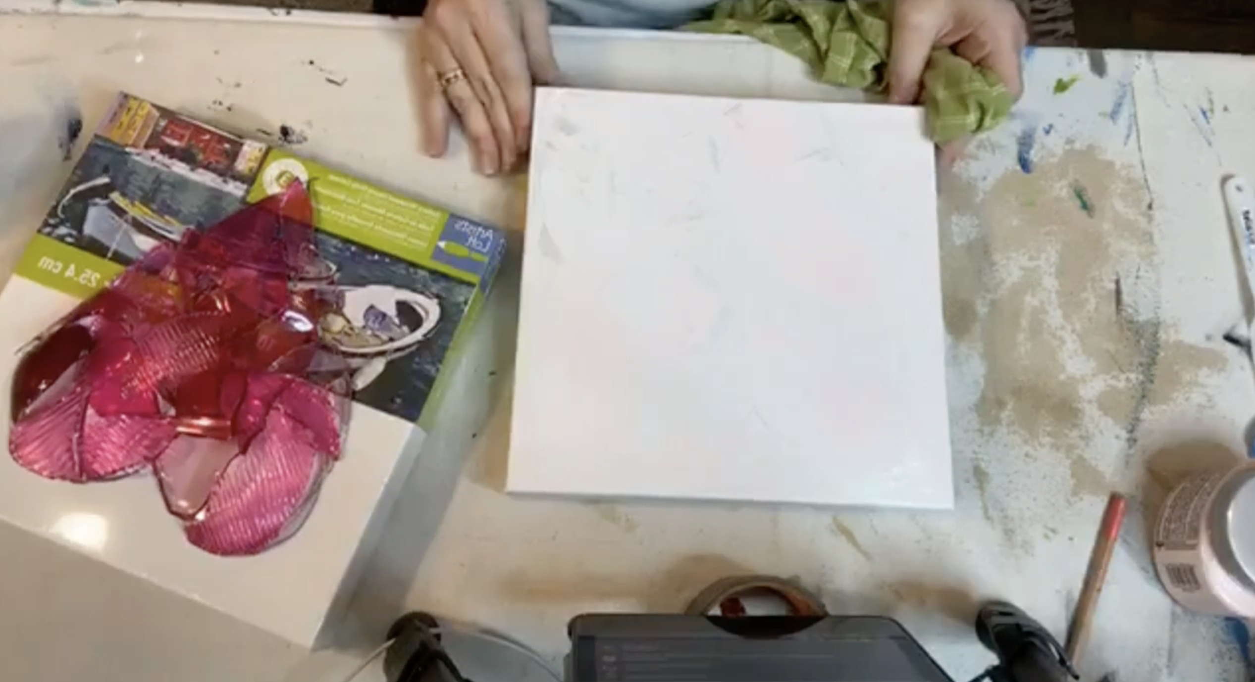 Start by covering the entire canvas with white paint. Once thatâs down, add just a tiny drop of French Gray into a bit of white paint and brush it across the canvas to create a warm, rustic white background instead of stark white. This small change matters, because it helps the white fur and the glass beard stand out instead of disappearing into the canvas.